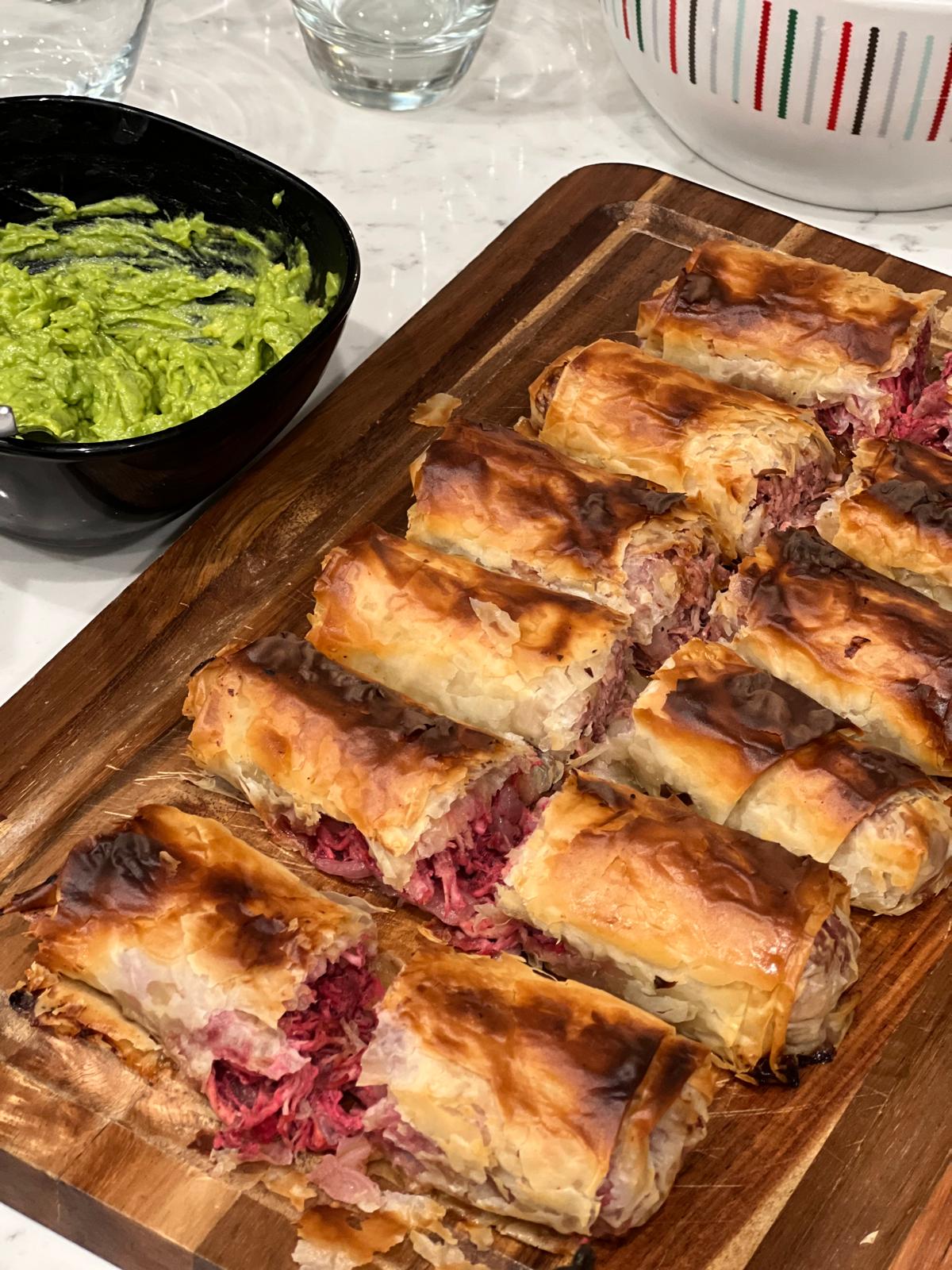 Available for local delivery or pickup. Not for shipping. Chicken rolls, or otherwise known as Musakhan rolls, are made with shredded chicken, sumac, spices, pine nuts, caramelized onions and olive oil wrapped in filo dough.